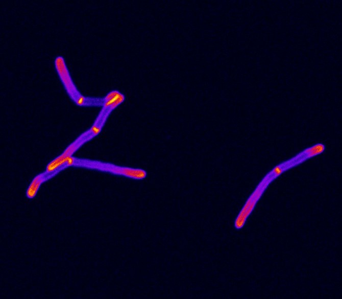 En esta imagen, tomada por un microscopio confocal, podemos ver células de la bacteria Mycobacterium smegmatis realizando la división celular. Esta bacteria es inofensiva para el ser humano pero se usa como modelo en investigación científica para estudiar a su "prima peligrosa", Mycobacterium tuberculosis, que causa la tuberculosis.