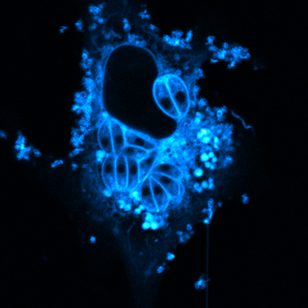 La imagen corresponde a una célula infectada con el microorganismo. Fue tomada por la Unidad de Bioimagenología Avanzada del instituto con una técnica de microscopía confocal espectral, que permite apreciar los cambios en la composición de las membranas de la célula.