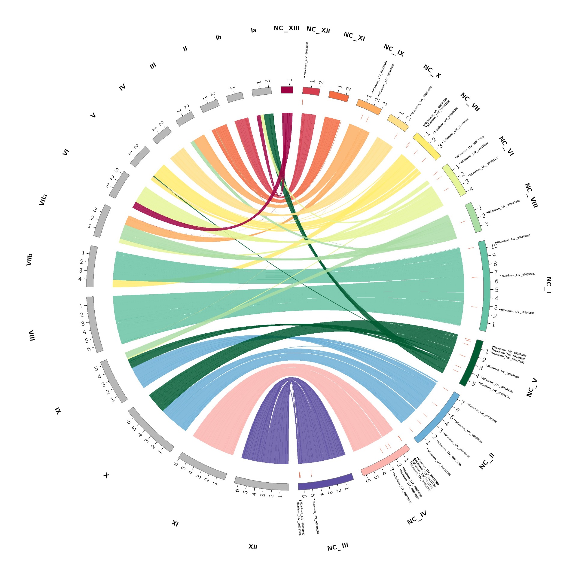 Para ello, la ciencia utiliza herramientas informáticas de genómica comparativa, entre ellas una conocida como circos genómicos, diseñada específicamente para visualizar y comparar genomas. Estos gráficos tienen forma de círculo y muestran los cromosomas —o secuencias genéticas— que componen dos genomas: uno en la mitad derecha y otro en la mitad izquierda.
