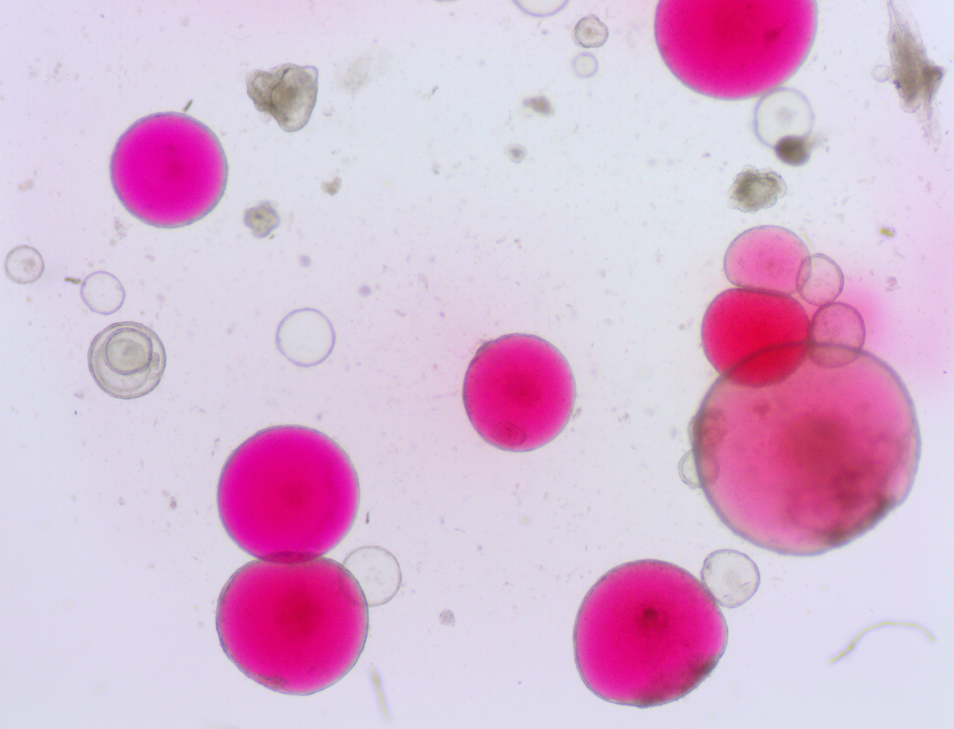 En la imagen, todas los círculos son mini intestinos. Los círculos rosados son aquellos que fueron infectados con bacterias de Salmonella mezcladas con un colorante especial (rojo fenol) para poder verlas al microscopio. Los círculos grisáseos son los organoides que no han sido inyectados con bacterias,,